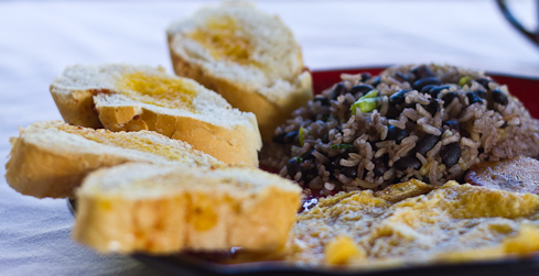 Gallo Pinto which consists of rice mixed with black beans, served with natilla (sour cream), eggs and fried plantain.
